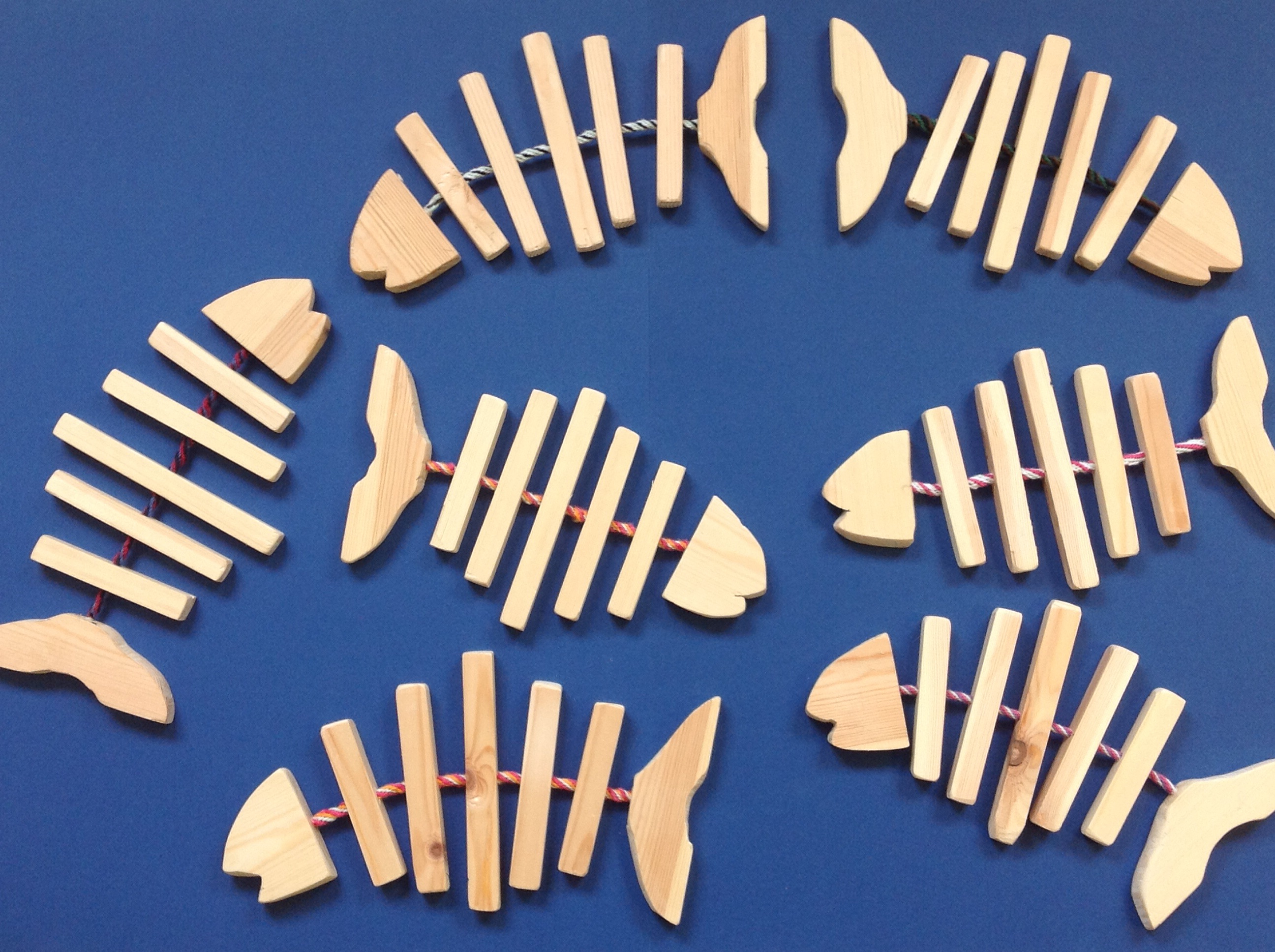 Grytunderlägg Treorna och fyrorna har gjort grytunderlägg i form av en (uppäten!) fisk på slöjden. Vi har sågat, slipat och borrat och knutit band av 12 olika trådar till ryggraden. Här ser ni några som har blivit färdiga.