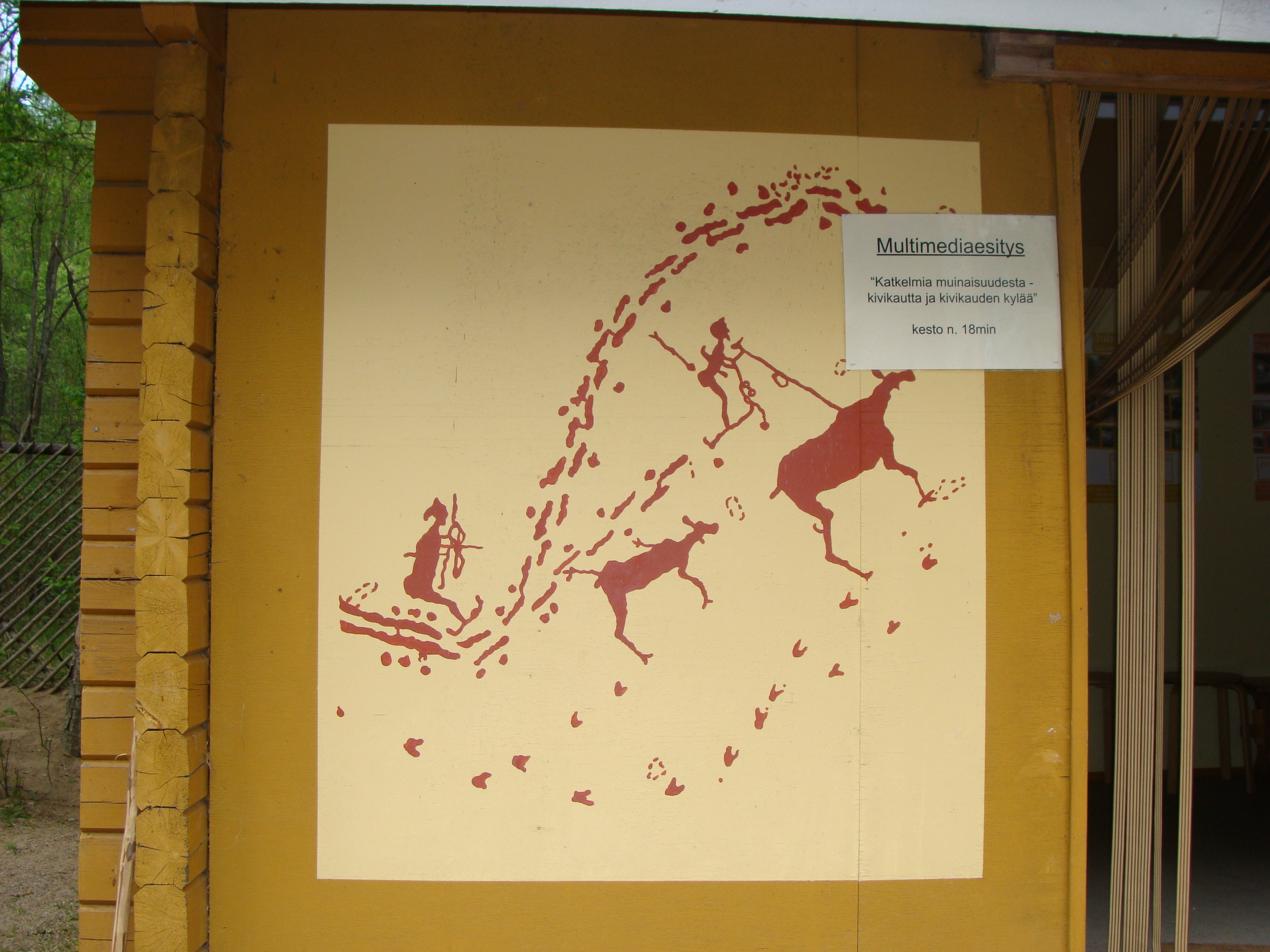 Stenåldersbilder Saarijärvi Stenåldershydda Fångstgrop Kastspjut Kamkeramik eller gropkeramik För att göra upp eld Skogsmård Gäddor som rökts och torkats Krok av ben Båtar man gjort av stockar Harpuner av ben för att fånga fisk Fiskkasse av vidjor Lerkruka. Kamkeramik Skinn som spänts ut för att torka För att fånga fisk, en slags ryssja Ett stort stenåldershus Man kunde ta elden till hjälp när man skulle gröpa ur en stock Det går att hugga av träd med stenyxor – bevisligen Såhär kan hällristningar se ut Motiv från hällristningar